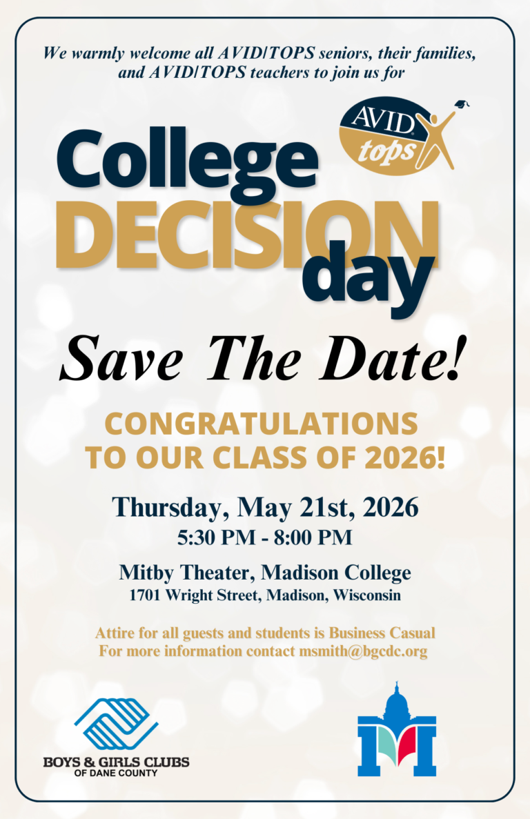 College Decision Day is a special celebration that honors AVID/TOPS students from La Follette, Memorial, East, and West High Schools as they declare their postsecondary plans and prepare for life after graduation. This partnership event between the Madison Metropolitan School District and the Boys & Girls Clubs of Dane County brings together families, Senior Support Teams, and community guests to recognize the hard work and achievements of these scholars. The students are part of the AVID (Advancement via Individual Determination) program, a college readiness system that offers support in organization, study skills, critical thinking, and career exploration. Through a powerful collaboration with the TOPS (Teens of Promise) program, AVID students receive additional resources and mentorship from Boys & Girls Clubs of Dane County, helping ensure they are ready for the next step in their journey.