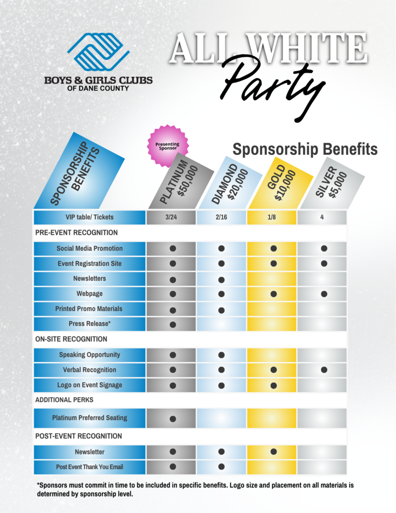 Sponsorship opportunities offer a unique way to bring your team together for a memorable night out while making a meaningful impact. By sponsoring a table, you and your colleagues will enjoy preferred seating, a shared experience at one of the year’s most exciting events, and valuable visibility through marketing and recognition opportunities. It is a great way to celebrate your team while supporting the work of Boys & Girls Clubs of Dane County.